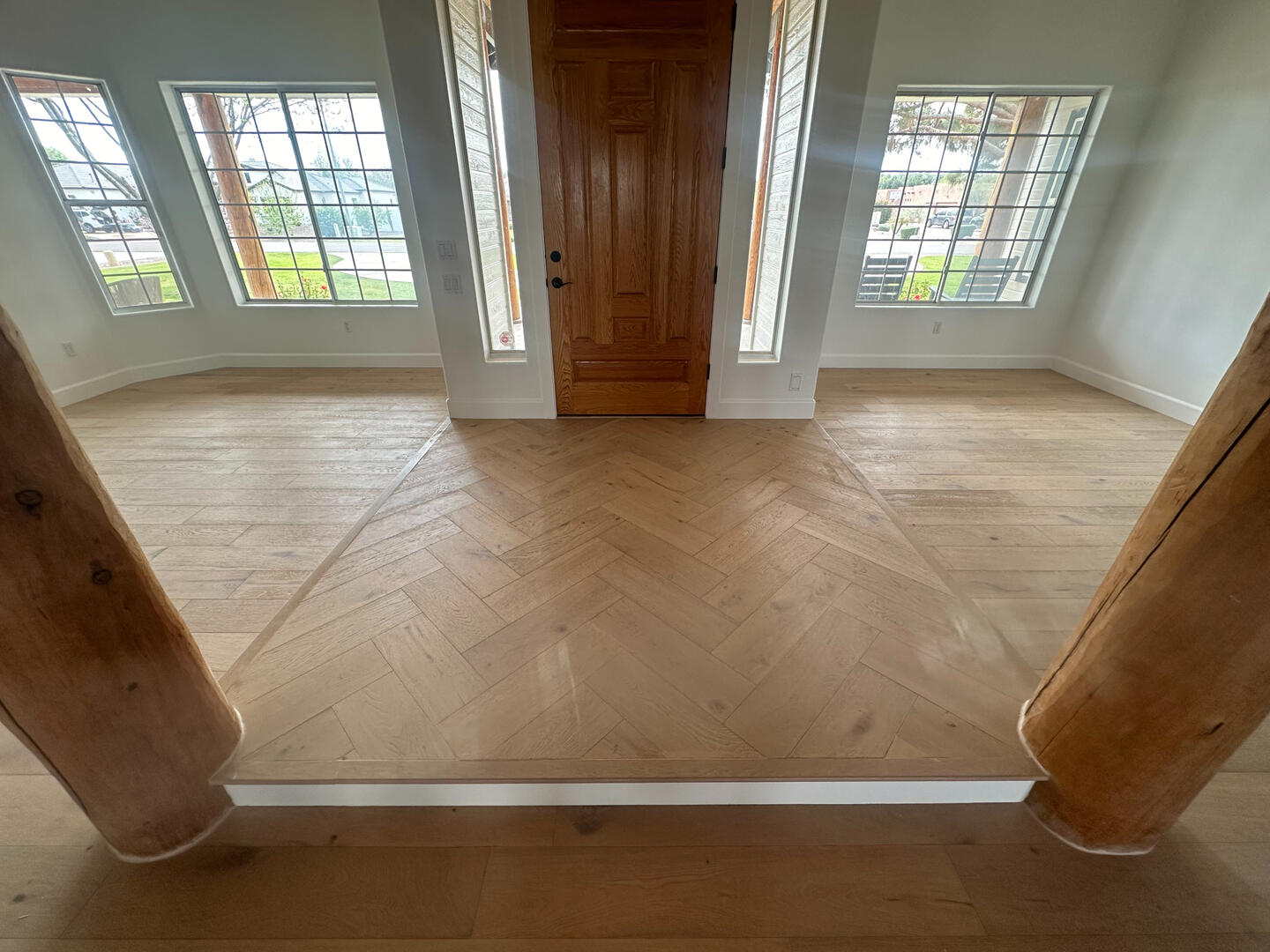 Welcome elegance into your home with beautifully laid engineered wood flooring, designed to enhance every corner with its refined texture and durability. This herringbone pattern adds a touch of sophistication that instantly elevates your space, creating a warm and inviting atmosphere. At Valley Flooring, we turn your flooring dreams into reality, one plank at a time.